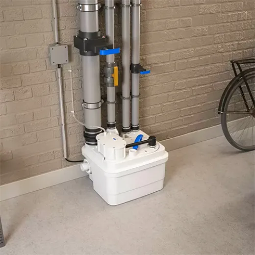 The client wishes to install a toilet and sink in a very small space in the new layout of their attic, where the walls are lightweight. They want to save space by removing the often bulky water tank while maintaining an aesthetic look. Vertical discharge needs to be achieved at 2.5 m and across a horizontal distance of 5 m.